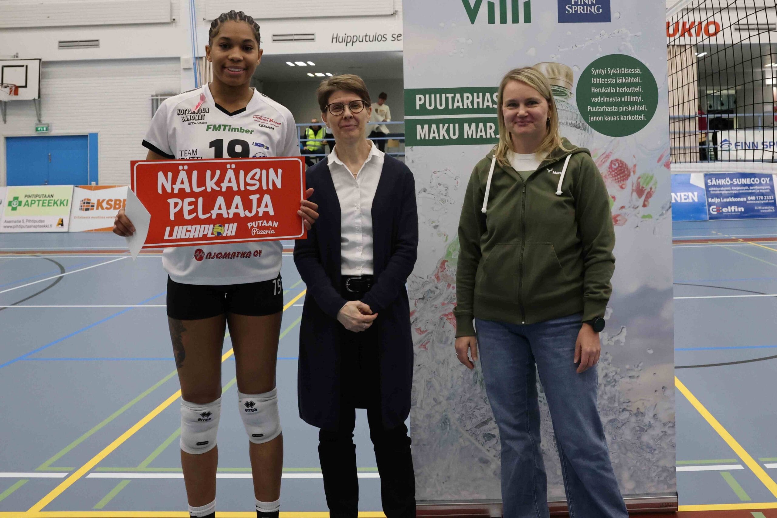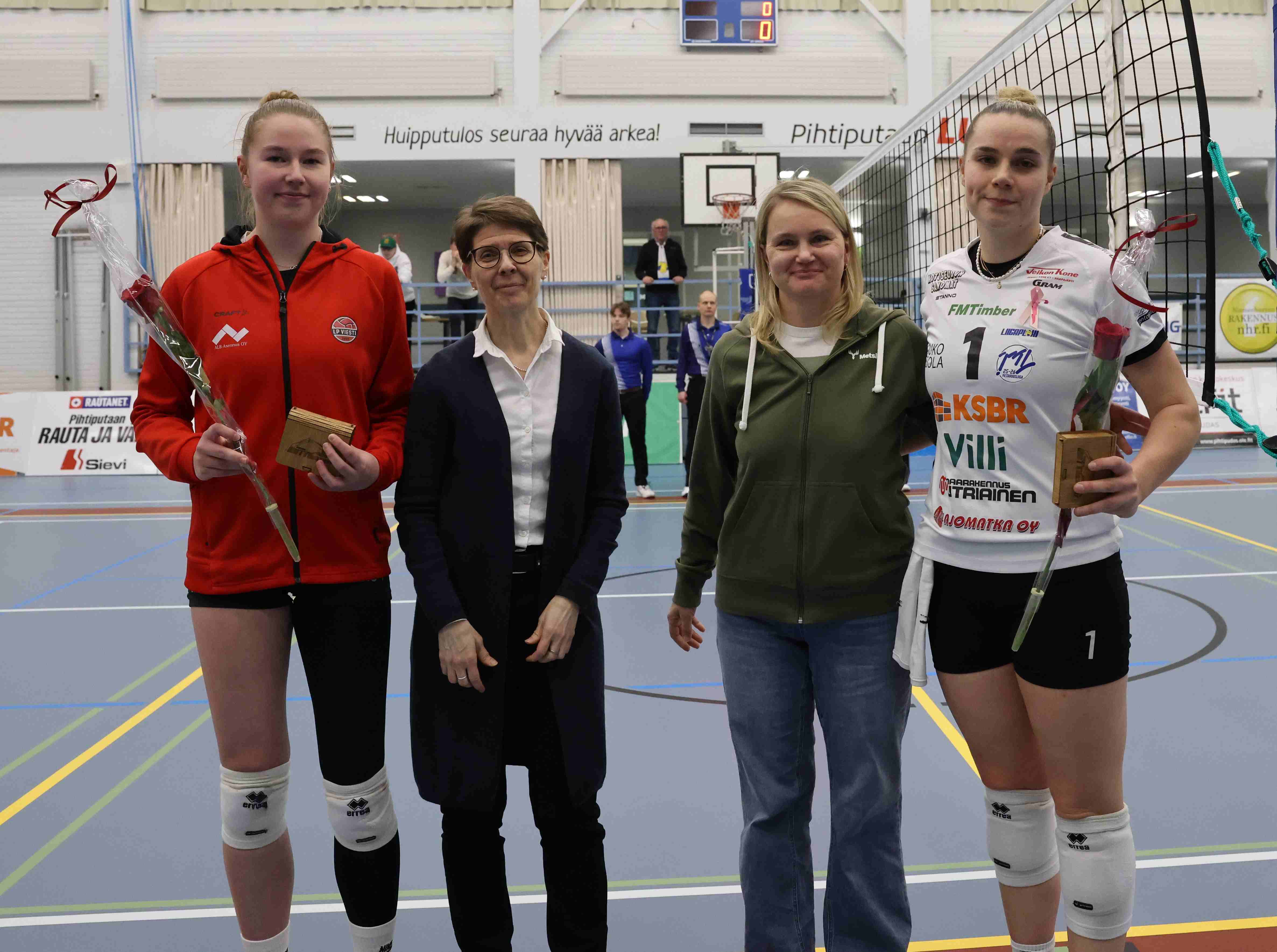 Otteluisäntä Team Metsä palkitsi parhaina pelaajina LiigaPlokin Marily Lassin ja LP Viestin Selma Nikkasen. Palkintoja jakamassa Karoliina Niemi ja Suvi Strandman.